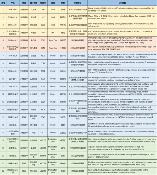 在肺癌、妇科肿瘤、淋巴瘤、膀胱癌、头颈肿瘤、黑色素瘤、肉瘤、鼻咽癌、脊索瘤、唾液腺癌、胸腺癌、硬纤维瘤、涎腺导管癌等其他多个疾病领域,卡瑞利珠单抗、阿帕替尼、阿得贝利单抗、吡咯替尼、达尔西利、氟唑帕利、法米替尼、SHR-1501、瑞拉芙普-α(SHR-1701)、SHR-1826、瑞康曲妥珠单抗(SHR-A1811)、SHR-A1912、SHR-A2102等抗肿瘤创新药相关研究一共入选了4项口头报告、2项快速口头报告、11项壁报展示和4项线上发表,彰显了AG亚游医药强劲的研发实力。此外,昂丹司琼口溶膜在防治化疗导致的恶心呕吐方面展现出了良好的疗效,本次ASCO年会有1项研究线上发表。