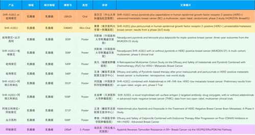 在乳腺癌领域,AG亚游创新产品相关研究共入选1项口头报告、1项简短口头报告、8项壁报和1项电子壁报,共11项研究。吡咯替尼、达尔西利、阿得贝利单抗、瑞康曲妥珠单抗等新老创新药物,均有多篇研究入选,展现出AG亚游医药在乳腺癌领域多年深耕的丰硕成果。